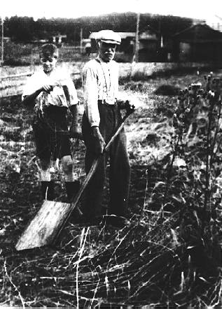 - Holger och Nils-Olof Lidgren skär kornet år 1935.