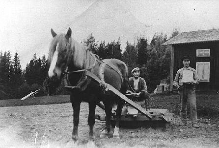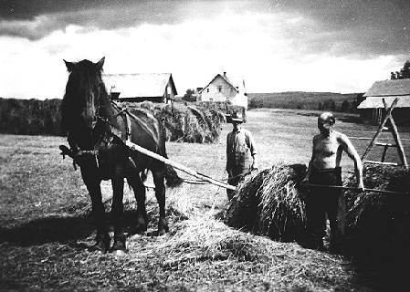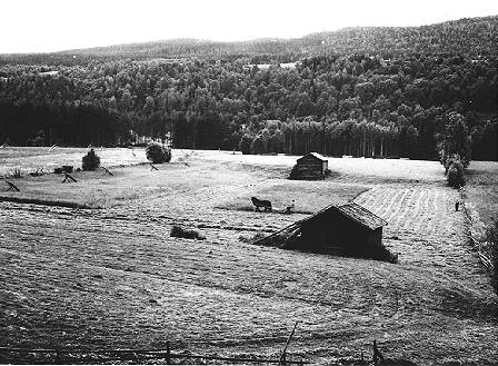 - Bernhard jonsson och Olof Hammar bärgar hö på "Skogen" år 1948. Skogen är ett gammalt gårdsnamn.