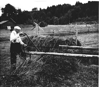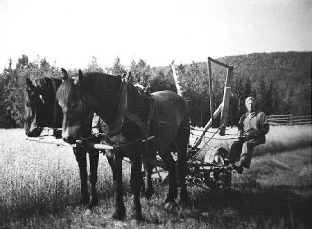 - Bernhard Jonsson i Långliden skördar havre år 1949.