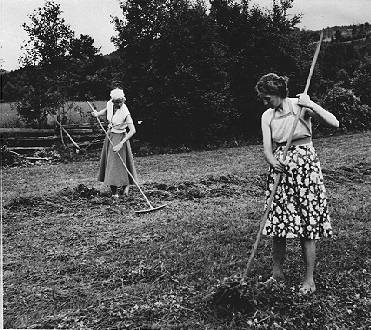 - Berit och Ingrid Annell i Boda hjälper till med höskörden år 1957.