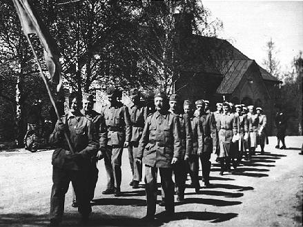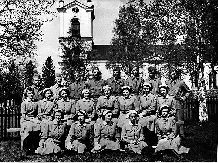 - Hemvärn och lottor under fanan år 1945. I bakgrunden ser man gamla sockenstugan.