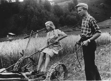 - Barbro och Holger Lidgren skär havre i Järkvissle år 1942.