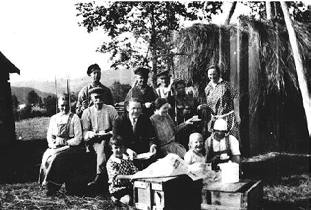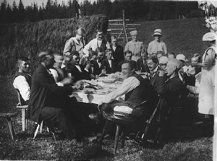 Från vänster rad 1 sittande: Betty och Oskar Jonsson, pastor Berg med fru och dotter, Gerd Oskarsson-Ytterbom och Ingrid Säll. Rad 2 stående: Olle Jonsson, Algot Uhlin, Sjölund från Bodacke, pojken med räfsan heter Jönsson och är från Malung, hans mor är född Törnkvist. Hand Lindkvists mor serverar kaffet.