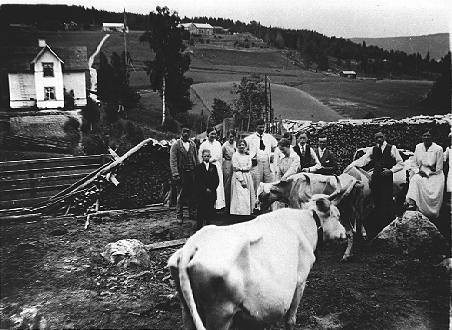 Från vänster: 1 Jonas Backlund 2 Hanna Backlund. Georg Backlund står framför sina föräldrar. Ingegerd och Gustav Adolf Backlund håller i en av korna. De övriga har kommit med "Indalen" för att hälsa på.