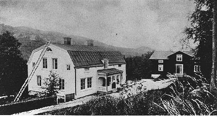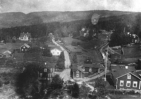 Vy över Byn med gårdarna Lars Nils, Nordenssons och Lindbergs. Obs Gamla kyrkan byggdes i slutet av 1400-talet.