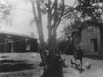 - Arne Jonsson framför "Vallan" en av de äldre gårdarna i Långliden ca 1920.