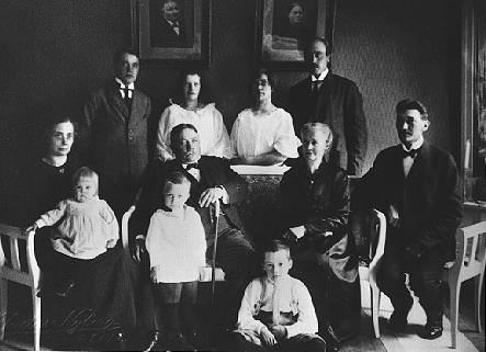 Från vänster rad 1: Hildegard Mellin med dottern Elin, Lar och Kristin Olson, Julius Mellin, Thure Mellin framför Lars Olsson och Gunnar Mehlin framför Kristin Olsson. Rad 2: Gustav Olsson, Frida Olsson, Erika Olsson och Maurits Olsson. Porträtten på väggen: Lars-Olof och Margareta Uhlin, Lars Olssons föräldrar.
