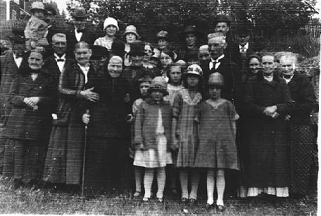 Bara en del av personerna tillhör Missionsförbundet. Från vänster rad 1: Anna Boström, Johanna Lind, Märta Stina Vestberg. Bakom småflickorna Petrus Lögdahl. Till vänster syns något av Erik Lindströms hus.