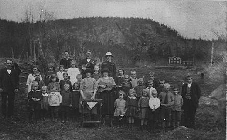 Till vänster Vilhelm Dahlström, Sunnås. Längst bak Signe Åström, Märrgård, Lars Svelander, Bodacke och Karin Olsson. Mitt fram Karin Svelander och Karin Andersson. Barn i huvudsak från Bodacke och Klärke.