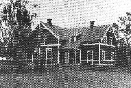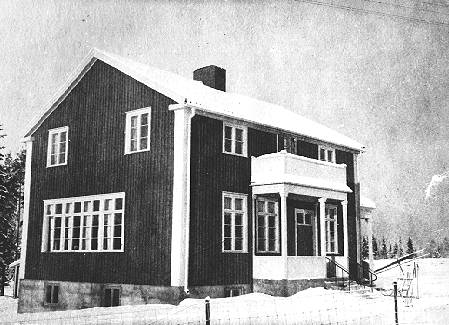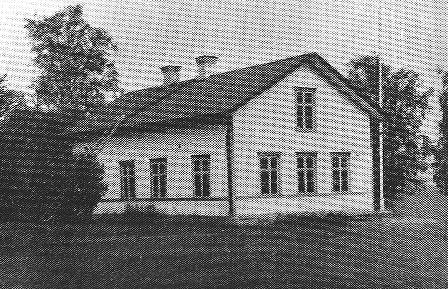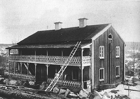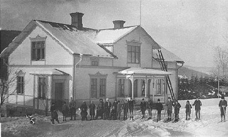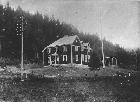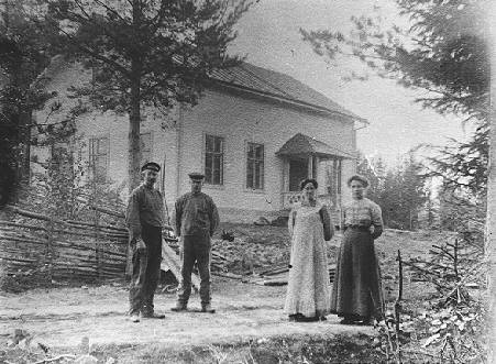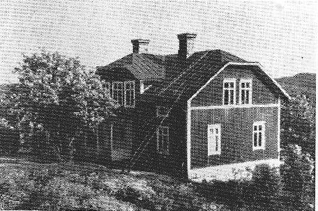 - Långlidens första skolhus byggt år 1900 - 1905. Selma Skoog längst till höger.