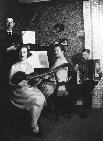 Joel Böhlén och Per Nygren, fiolspelare, bröderna Åslin, en meddragspel. Nelly Böhlen.